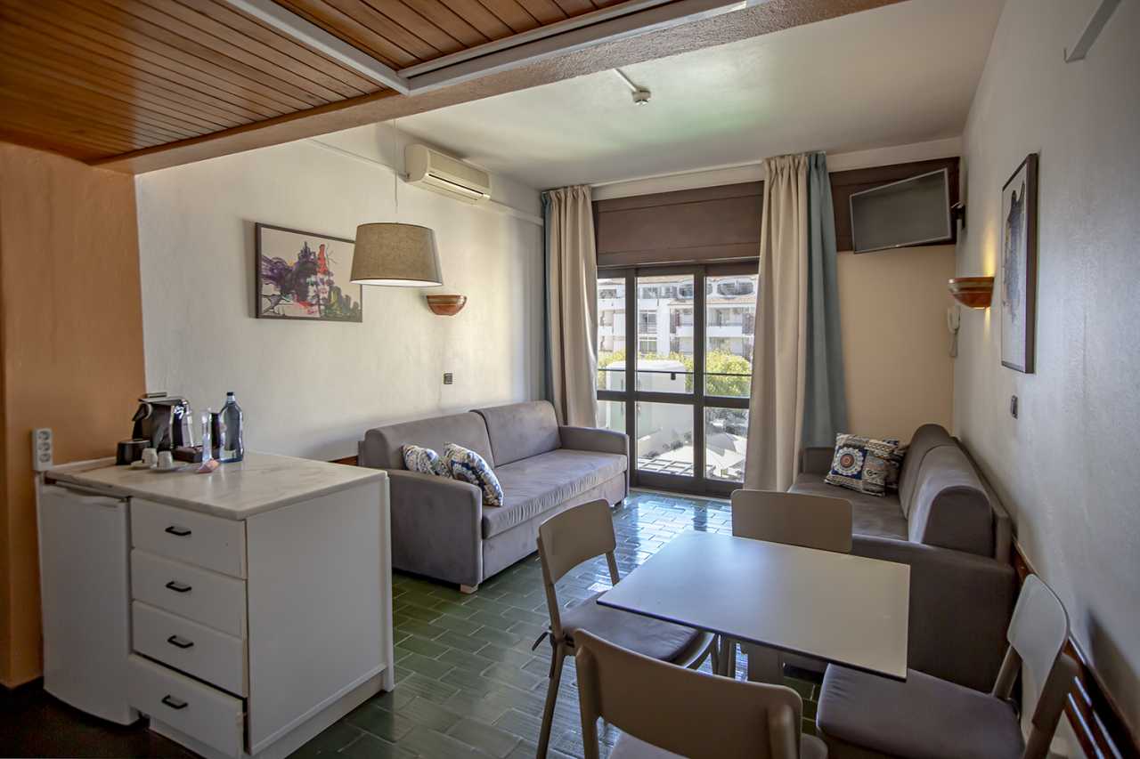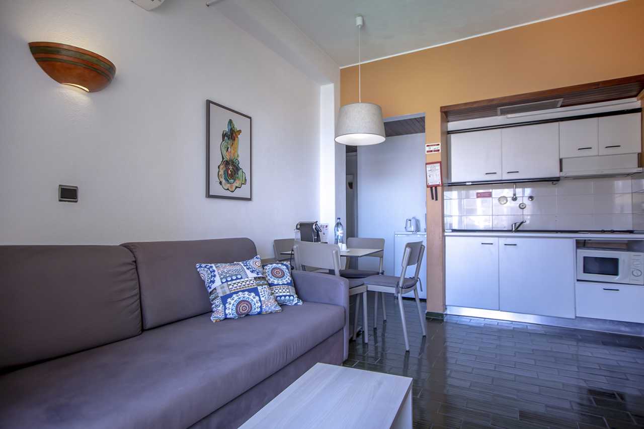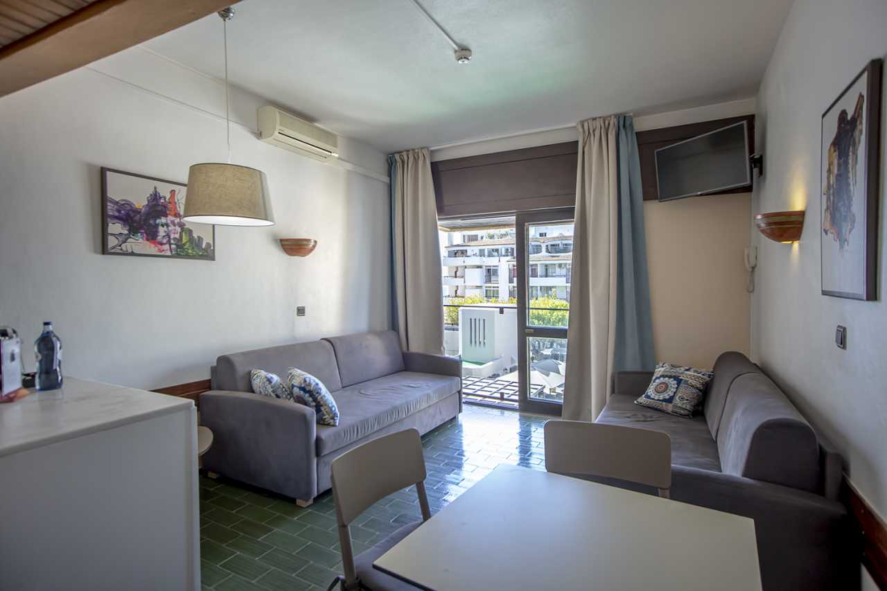 This 1 bedroom sea view apartment features 2 single beds, a sofa bed in the living room and a kitchenette.