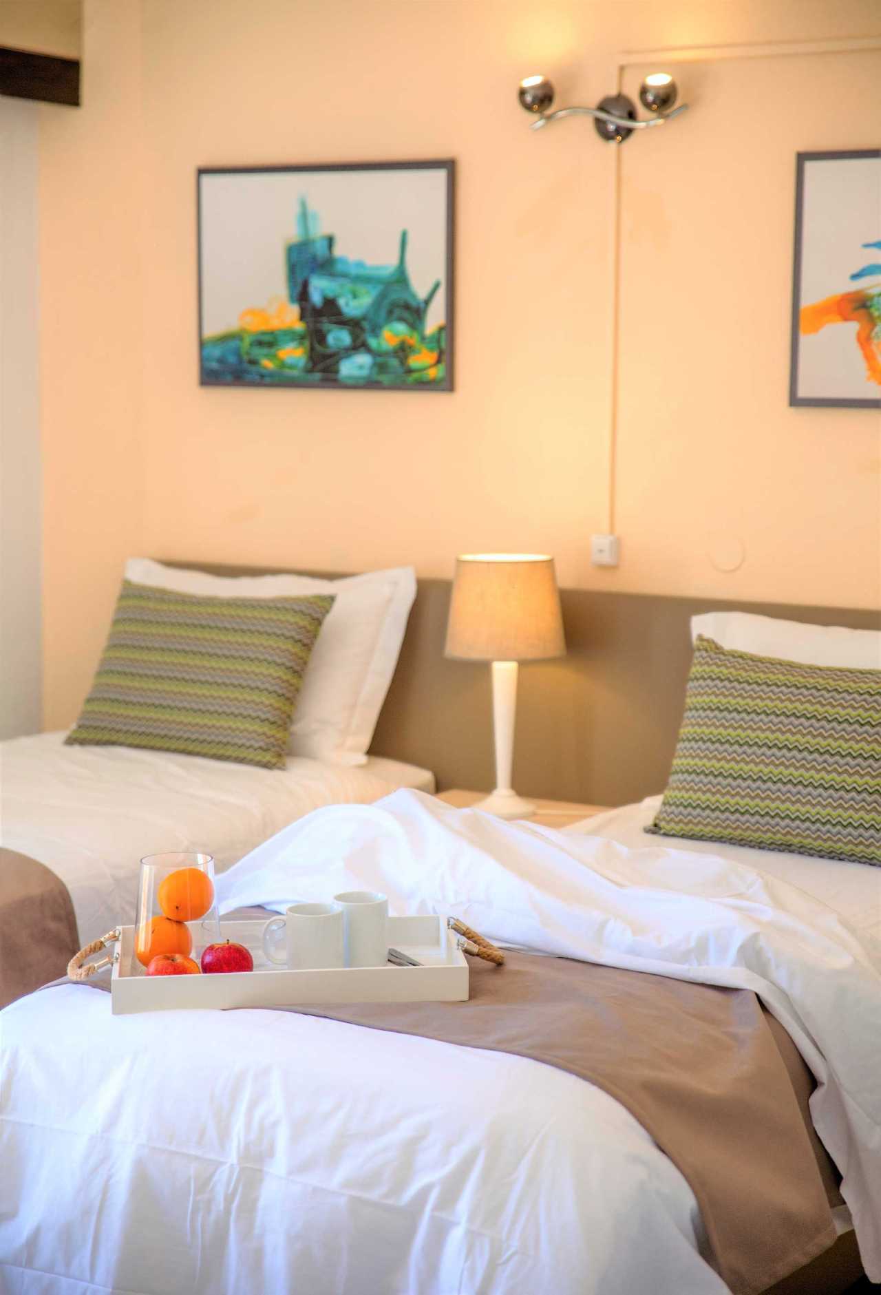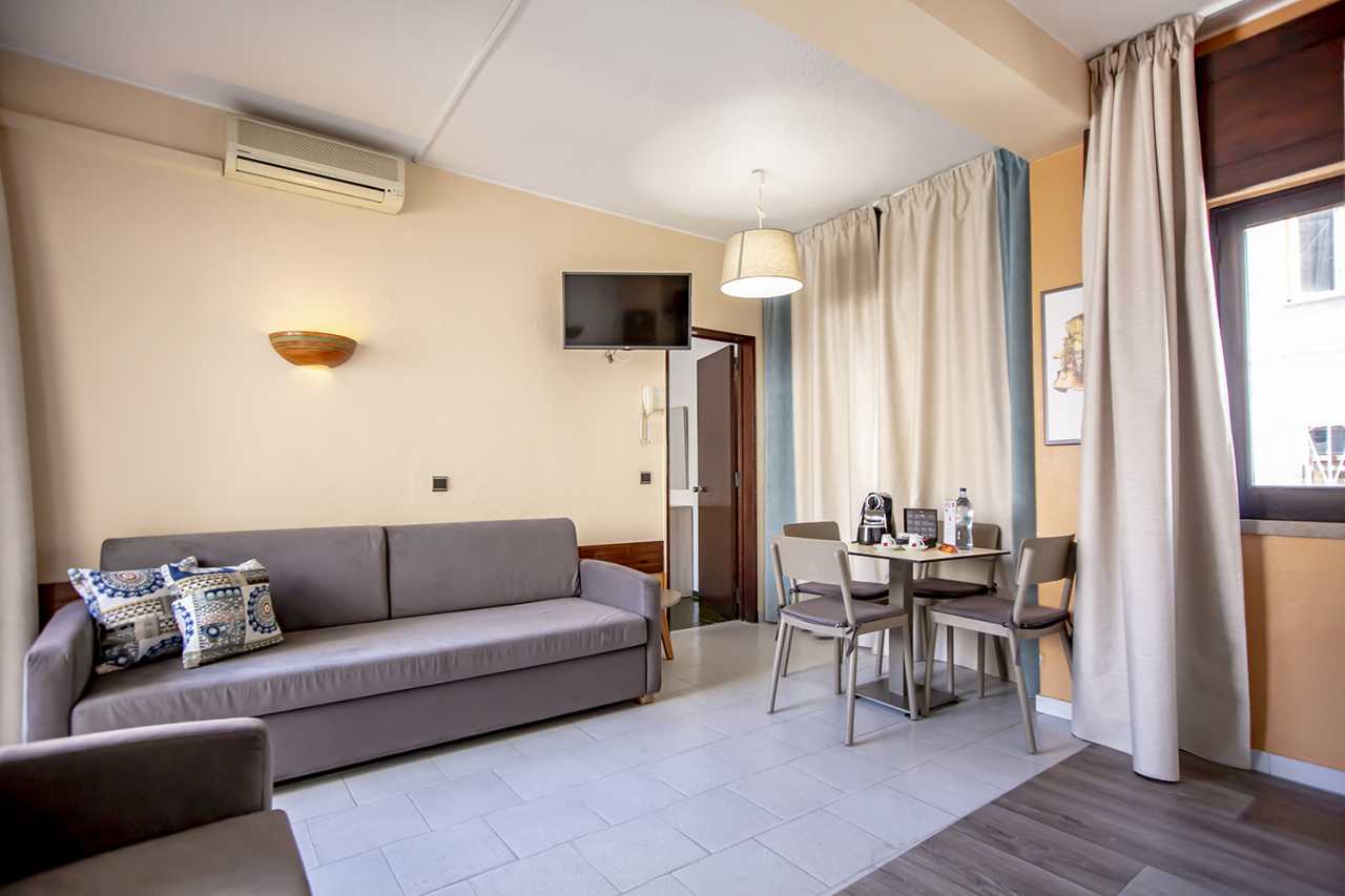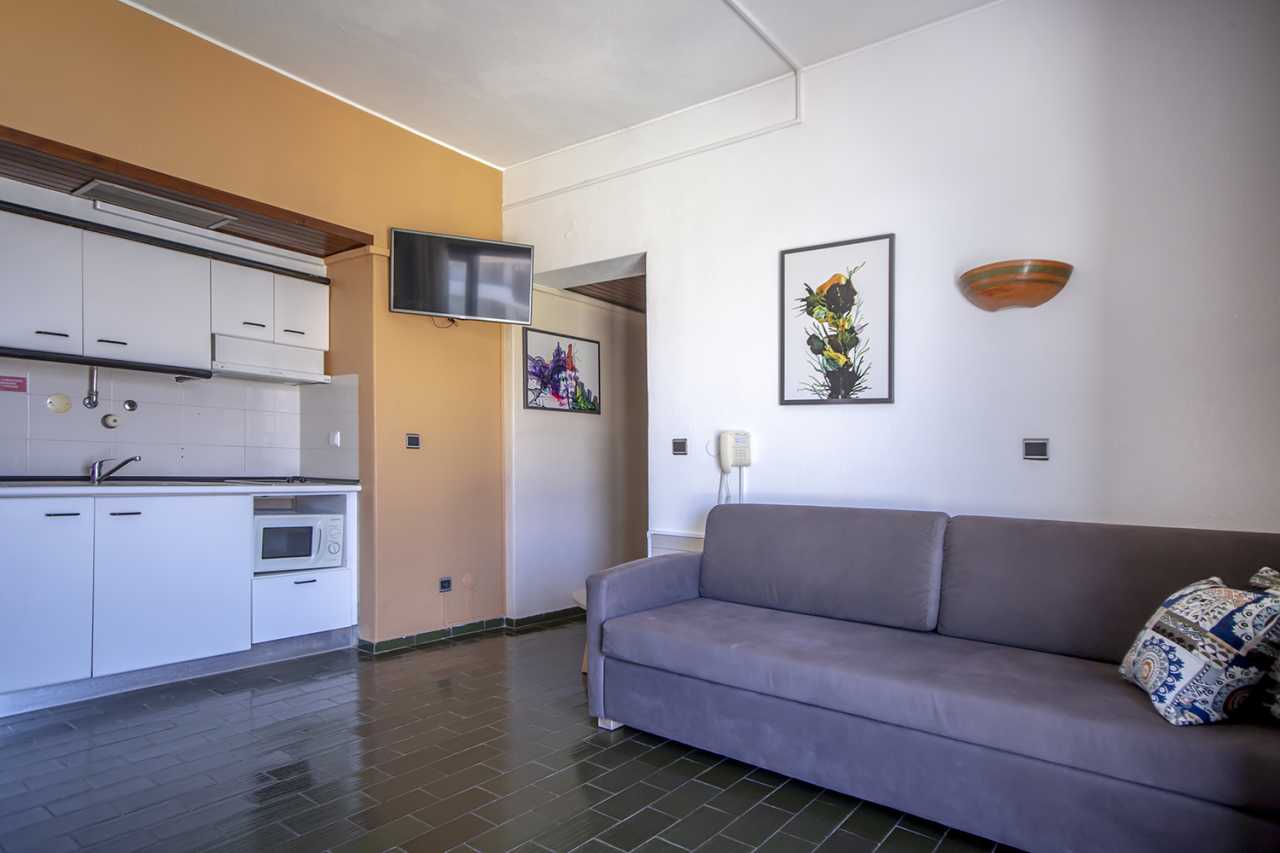 This 1 bedroom sea view apartment features 2 single beds, a sofa bed in the living room and a kitchenette.